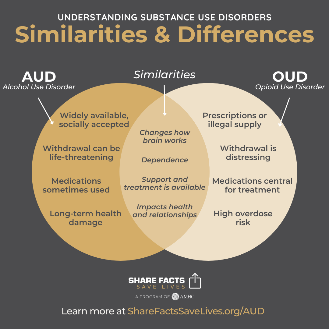 Alcohol Use Disorder (AUD) and Opioid Use Disorder (OUD) are both substance use disorders that affect the brain and behavior in similar ways. However, they also differ in their development, the risks they pose, and how they are treated.