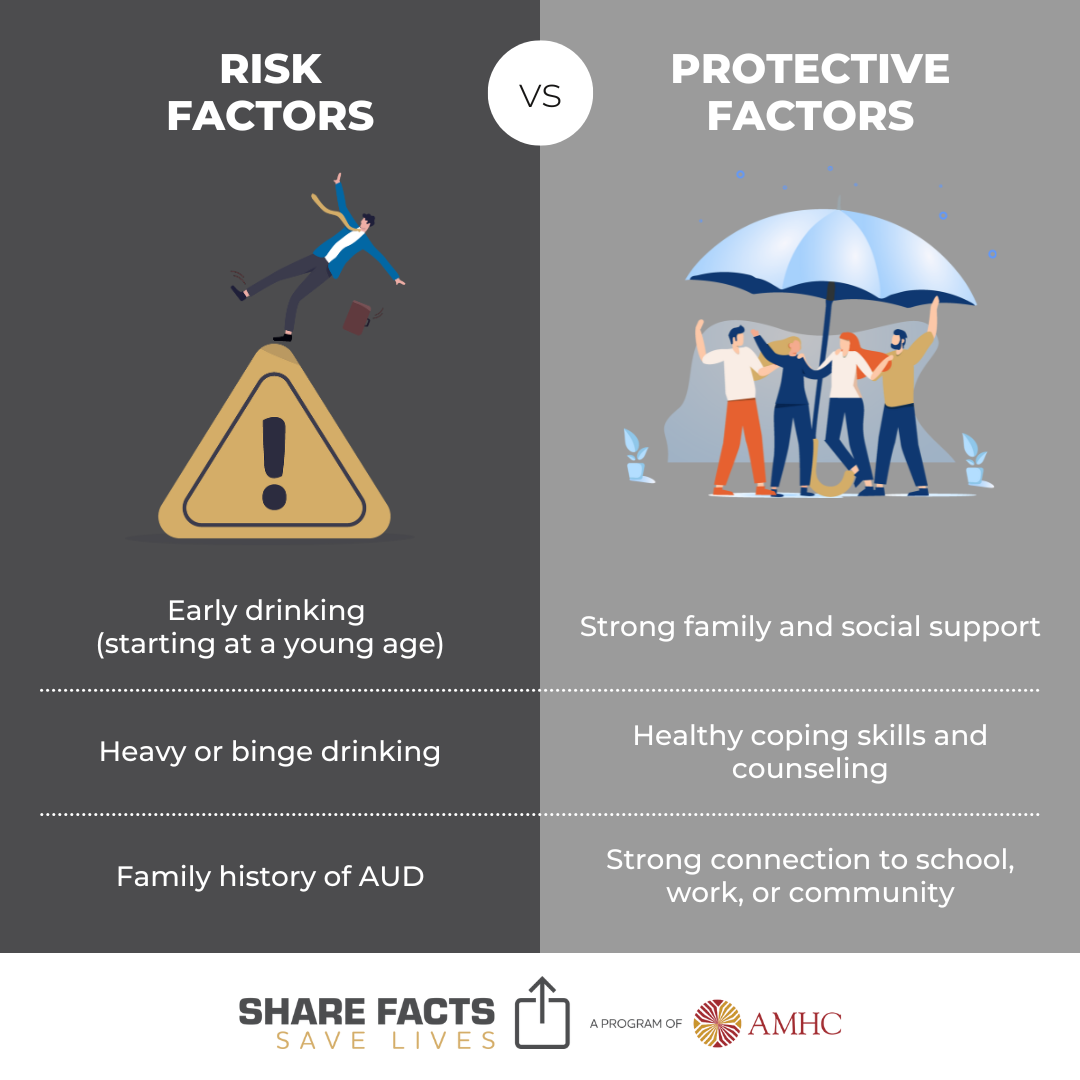 Not everyone with risk factors will develop Alcohol Use Disorder (AUD), and having protective factors does not guarantee prevention. But strengthening protective factors can help balance risks and lower the chance of alcohol becoming harmful. Risk and protective influences often overlap across family, social, individual, and community life.