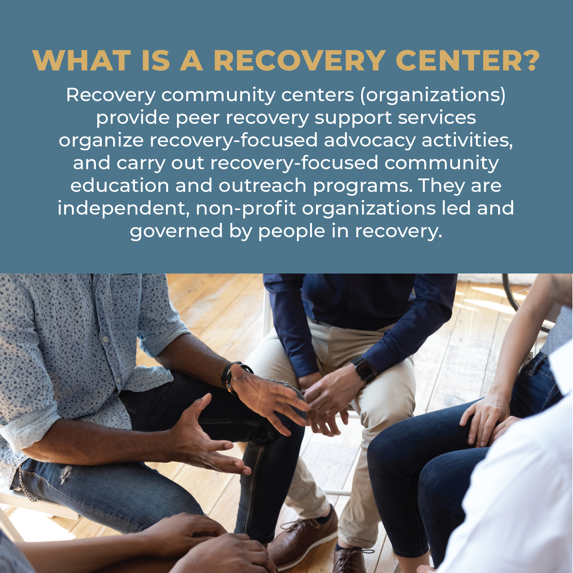Recovery community centers (organizations) provide peer recovery support services, organize recovery-focused advocacy activities, and carry out recovery-focused community education and outreach programs. They are independent, non-profit organizations led and governed by people in recovery. The broadly defined recovery community are people in long-term recovery, their families, friends, and allies, including recovery-focused addiction and recovery professionals. It also includes organizations whose members reflect religious, spiritual, and secular pathways of recovery. (22)