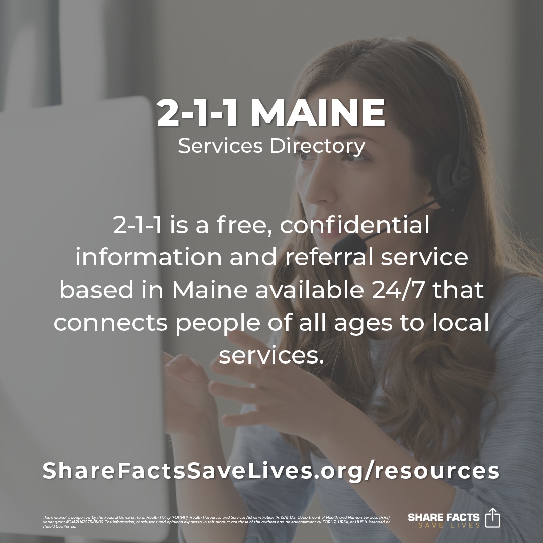 2-1-1 is a free, confidential information and referral service based in Maine available 24/7 that connects people of all ages to local services.